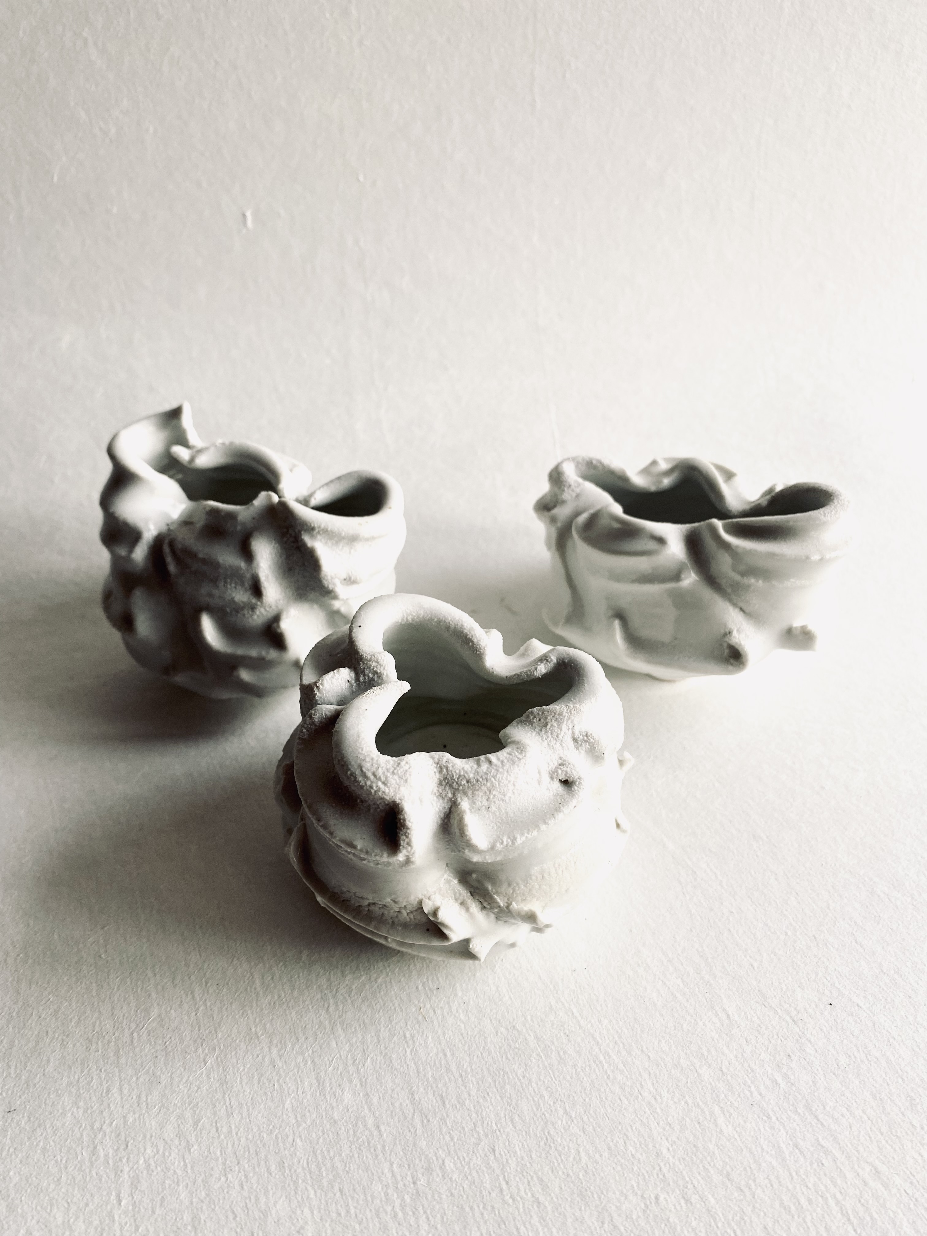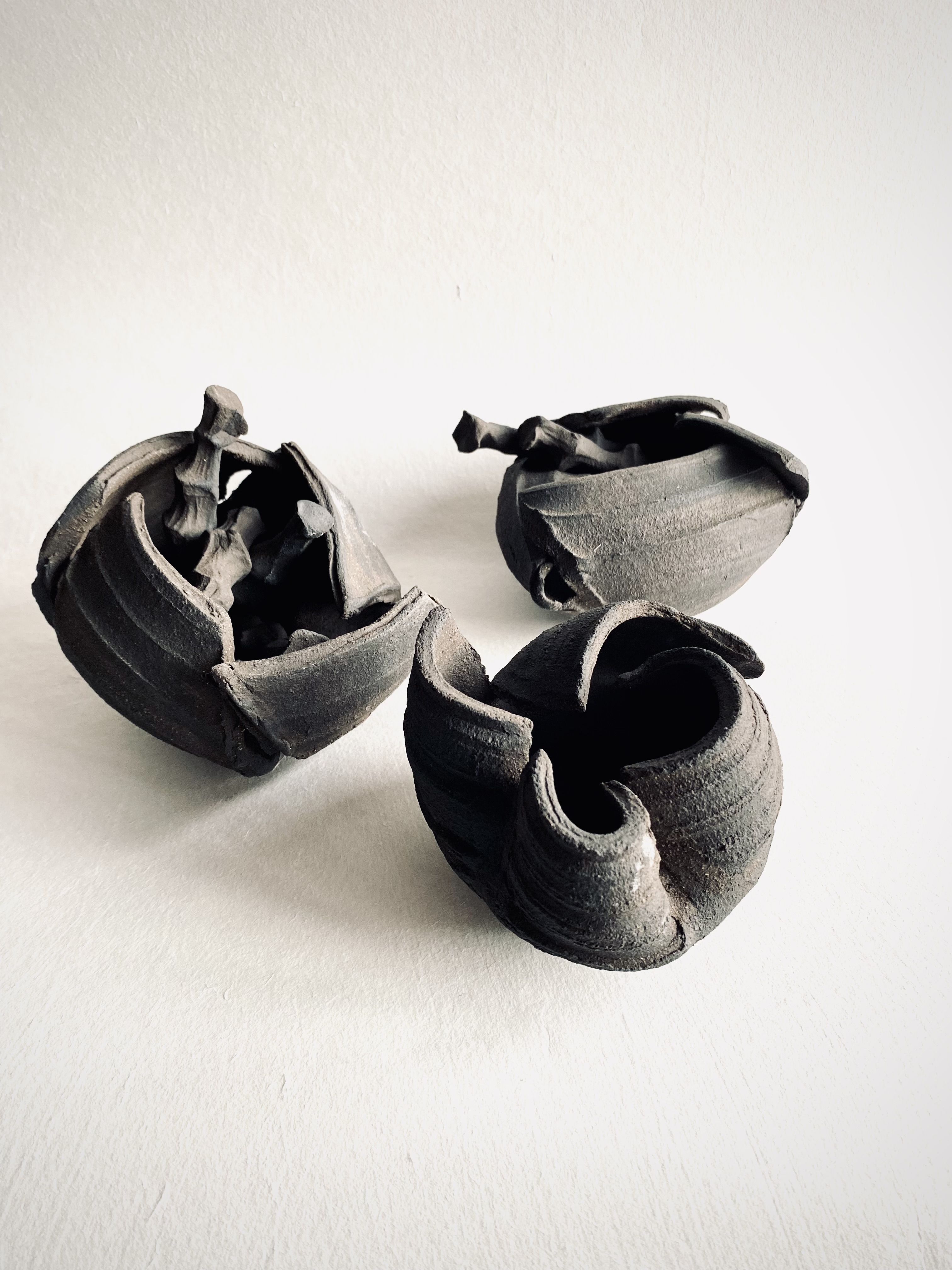 Nymphéas Nymphéas Grès et porcelaine. Ce sont des petites sculptures tournées comme des bols qui dans un deuxième temps seront modifiées afin d’évoquer les lobes des fleurs aquatiques.